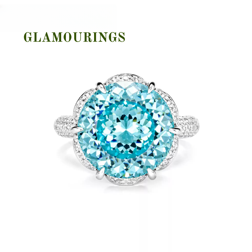 This "Ocean Bloom" ring is carefully crafted by GLAMOURINGS. The main stone is a full-carat laboratory-grown aquamarine cubic zirconia diamond. It is pure and transparent, with a hue as blue as the deep sea. Together with a circle of natural diamonds surrounding it, it creates a blooming flower-like shape. This laboratory-grown aquamarine has almost the same optical and physical performance as natural gemstones, showing pure and impurity-free fire and uniform and rich color.