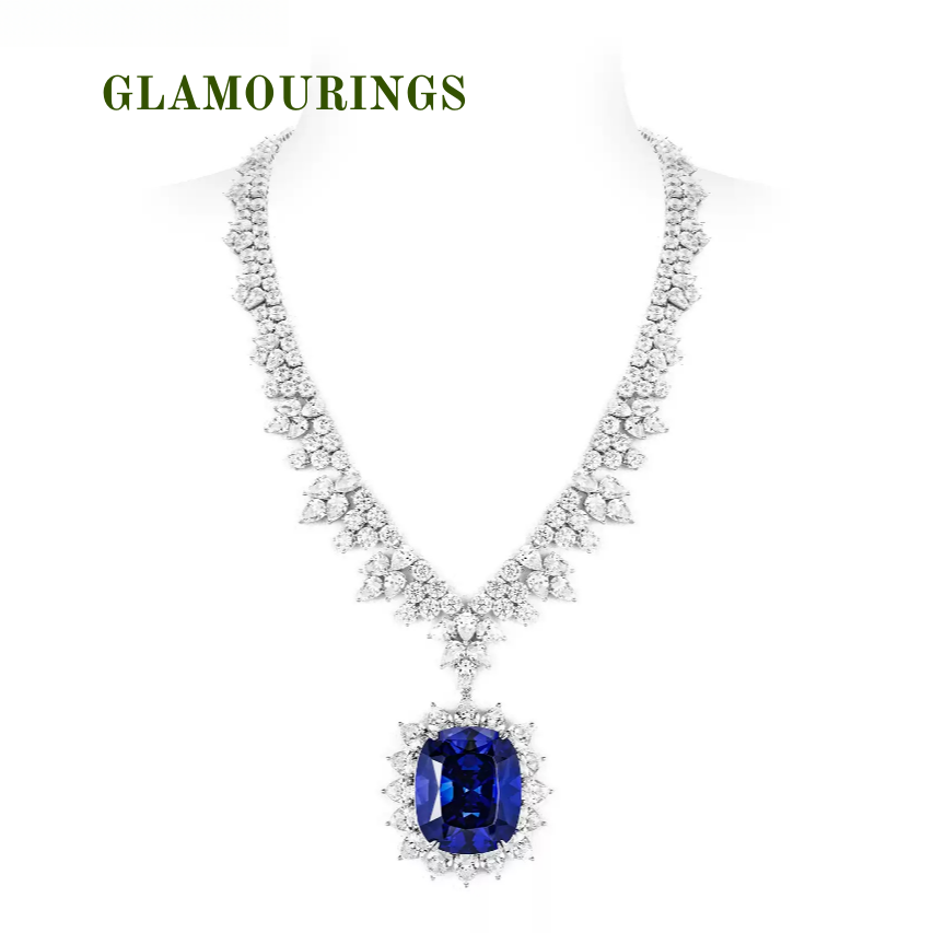 This regal necklace showcases a symmetrical V-shaped design, encrusted with round and marquise-cut moissanite diamonds, and crowned with a majestic deep royal blue sapphire in cushion cut. Framed by a radiant halo of diamonds, the centerpiece emanates aristocratic elegance and grandeur. It is a timeless masterpiece, ideal for the red carpet or royal gala events.